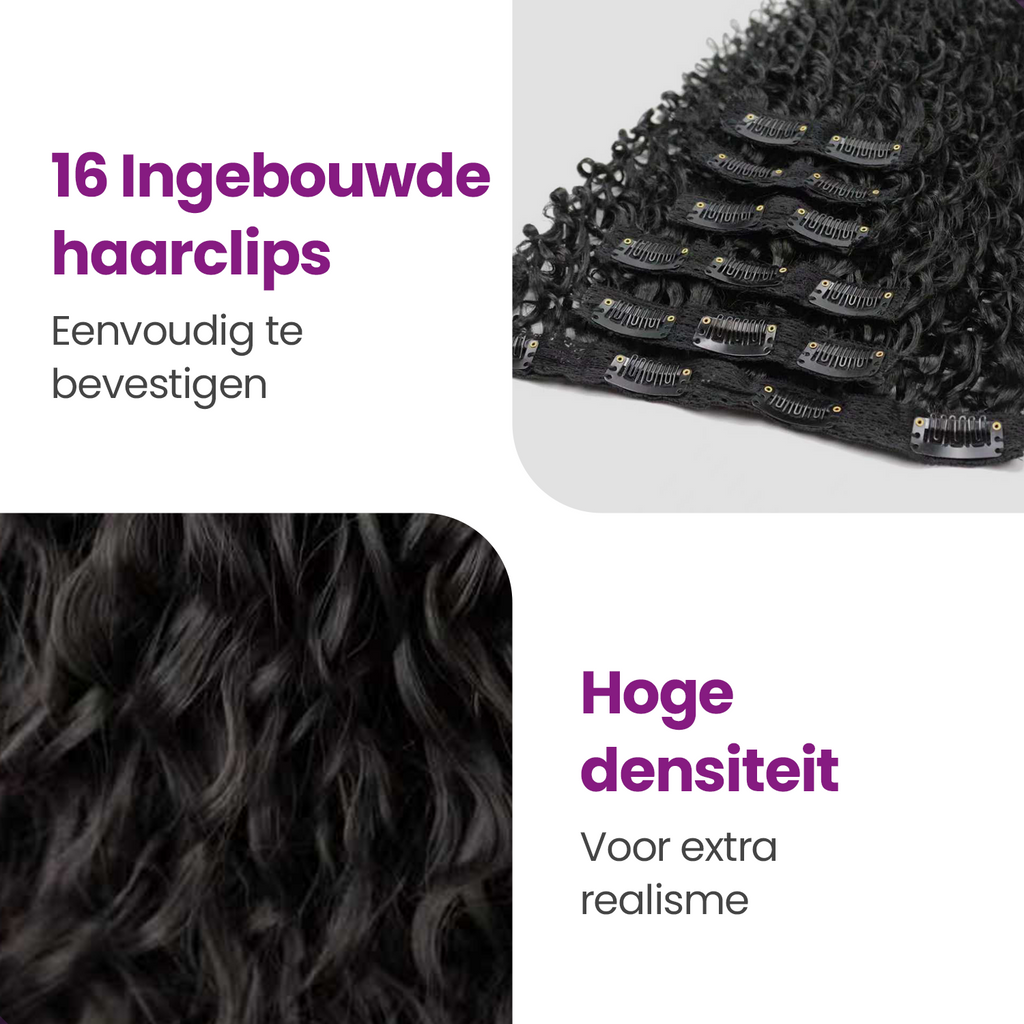 De clip-ins zijn eenvoudig te bevestigen en zorgen direct voor een weelderige, krullende haarverlenging.