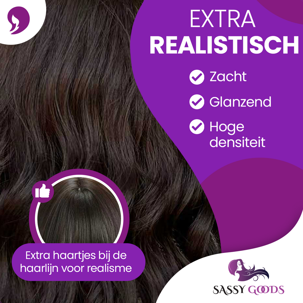 Deze donker bruine pruik is haast niet van echt te onderscheiden. Het natuurlijke haar zorgt er voor dat je elke dag weer met een glimlach in de spiegel kijkt.