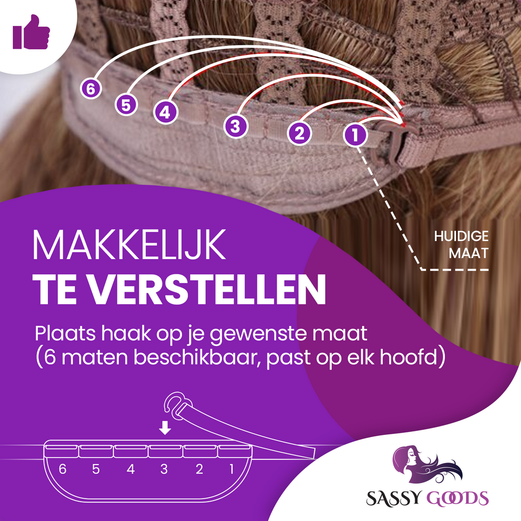 Innovatieve schuifjes: Dankzij de innovatieve schuifjes is deze pruik 100% verstelbaar. Pas de grootte aan je eigen hoofd aan, voor maximaal draagcomfort. Dit voorkomt dat de pruik niet lekker zit of dat het er niet natuurlijk uitziet.