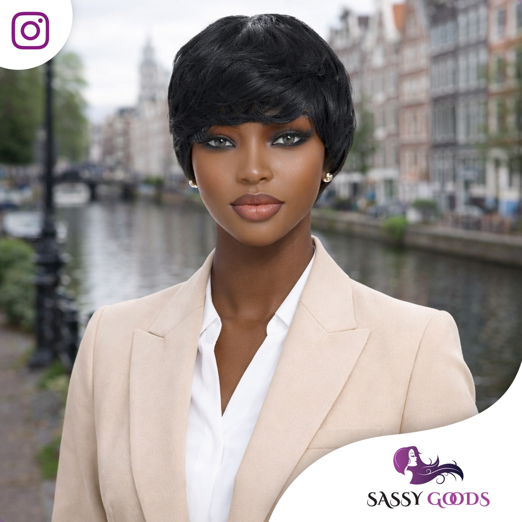 Bestel nu de SassyGoods Zwarte Pixie Pruik van 100% Echt Remy Haar en ervaar direct een natuurlijke, stijlvolle uitstraling met ultiem draagcomfort. Op voorraad = snel in huis. Voeg toe aan je winkelmandje en straal! 🖤